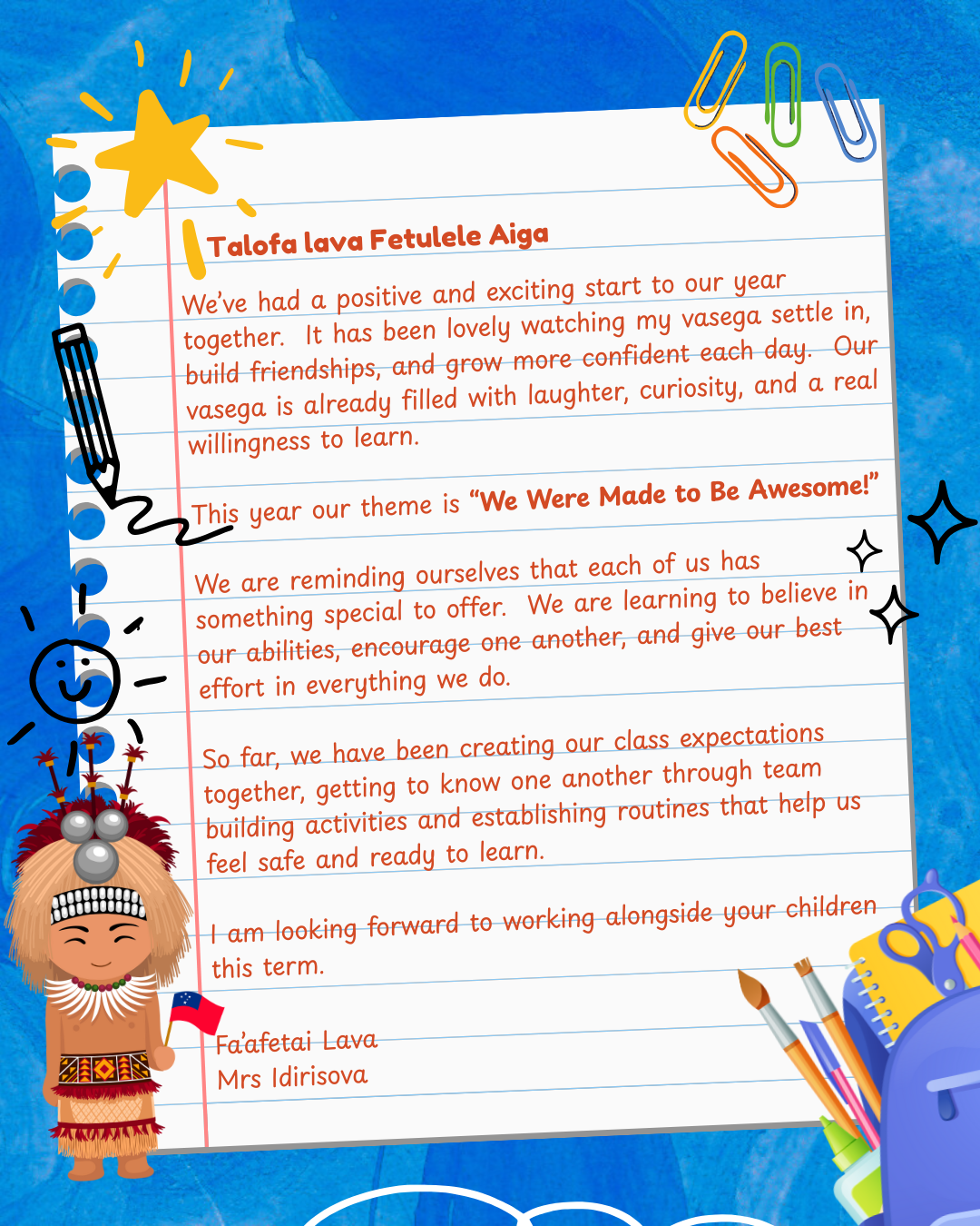 ia tatou a’oa’o faatasi, tuputupu a’e faatasi, ma ausia le manuia faatasi!